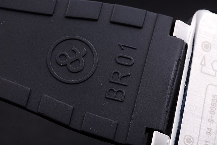 Bracelet: Zwarte rubberen band met warmte-logo in reli f, modelnummer en productcode en BR gegraveerd geborsteld roestvrij staal haak-gespsluiting
