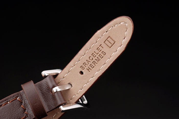 Bracelet: Verlengde bruine lederen band met warmte reli f stempel Armband Hermes en Hermes gegraveerde gepolijst roestvrij stalen haak-gespsluiting