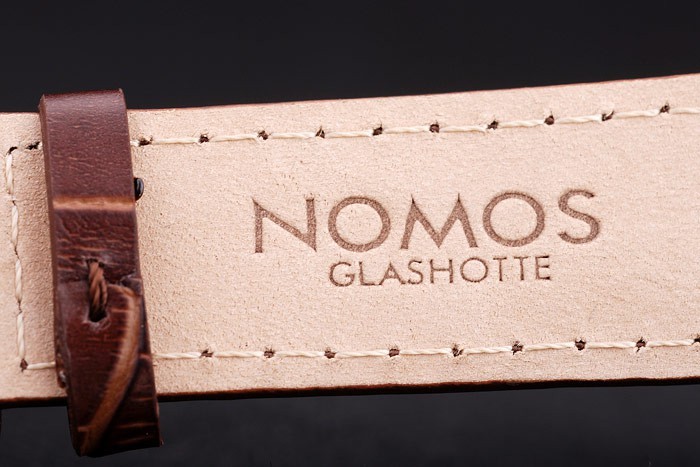 Back: gepolijst roestvrij staal vastgeschroefd terug met Nomos Glashütte graveren en transparante monteur onthullend center