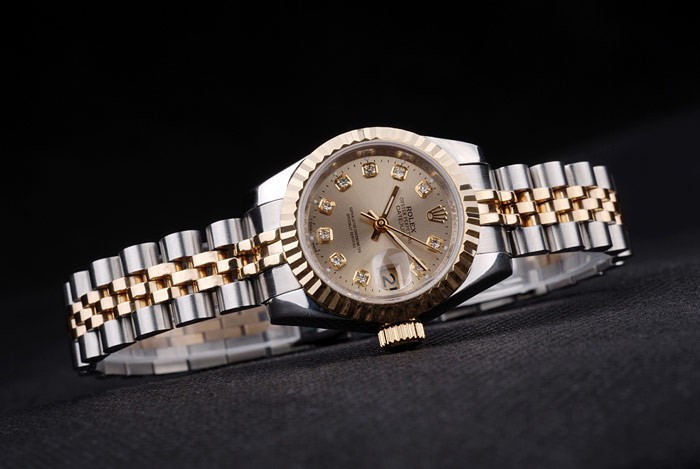 Bracelet: Twee gestemde schakelarmband van gepolijst roestvrij staal en 18k geel goud verguld staal met Rolex gravure verborgen slotje het weergeven van de Rolex logo