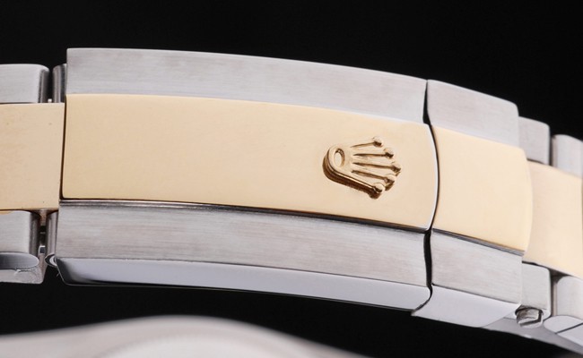 Bracelet: Twee gestemde schakelarmband in geborsteld roestvrij staal en 18k geel goud verguld staal met Rolex gravure vouw- in inzet sluiting weergeven van de Rolex logo