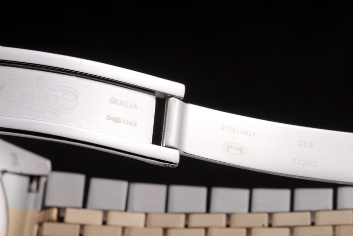 Bracelet: Twee gestemde schakelarmband in geborsteld roestvrij staal en 18k geel goud verguld staal met Rolex gegraveerd verborgen slotje het weergeven van de Rolex logo