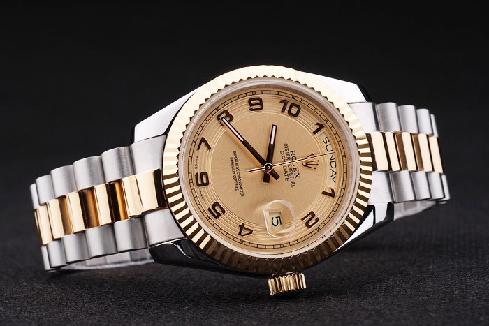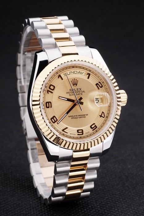 Bracelet: geborsteld roestvrij staal en geel gouden kettingen met vouw over sluiting en Rolex kroon engraving