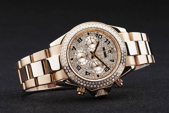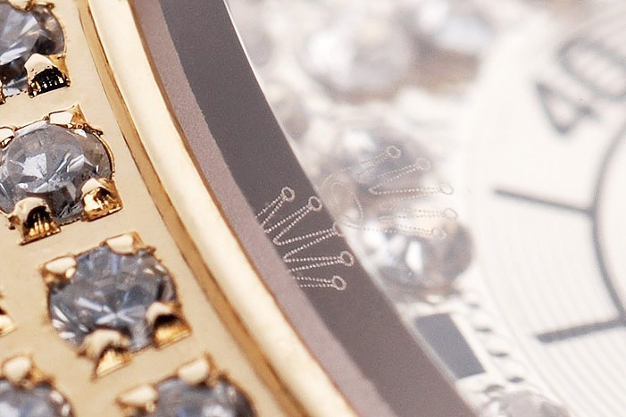 Crown: Gold afgezwakt cutwork kroon met Rolex-logo en twee extra kronen aan weerszijden van it