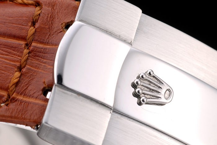 Crown: gepolijst roestvrij staal cutwork kroon met Rolex-logo en twee kleinere cutwork drukknop kronen aan weerszijden van it