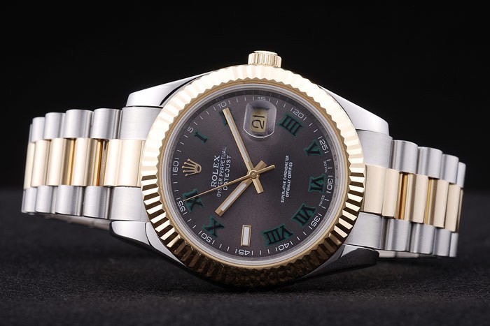 Bracelet: geborsteld roestvrij staal en geel goud schakelarmband met Rolex logo verborgen clasp