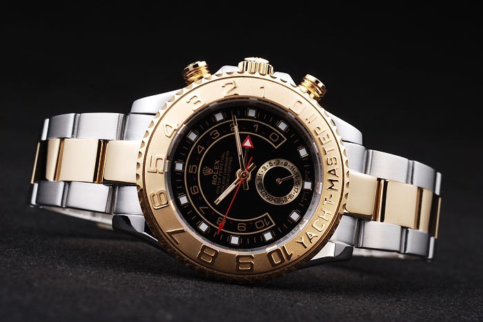 Bezel: Rose goud verguld eenrichtingsverkeer cutwork ring met 1-10 markeringen en Yacht Master graveren op een blauwe ge mailleerde background