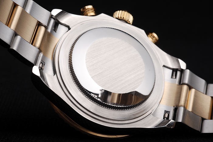 Bracelet: geborsteld roestvrij staal en rose-gouden schakelarmband met Rolex gravure in het interieur van de inzet sluiting en Rolex logo op top