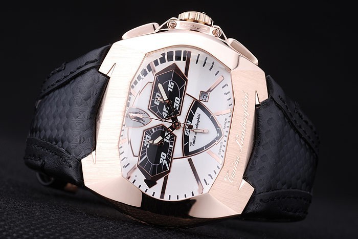 Crown: 18k rose vergulde cutwork kroon met Tonino Lamborghini logo en twee rode glazuur overgoten langwerpig drukknop kronen aan weerszijden van it