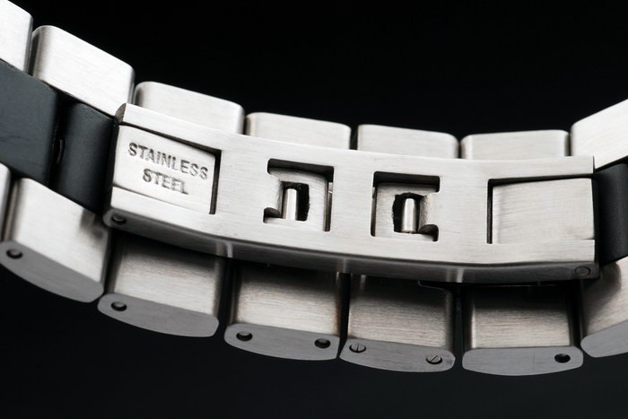 Bracelet: geborsteld roestvrij staal en getextureerde ion plated schakelarmband met verborgen sluiting en ‘Zenith’ inscription